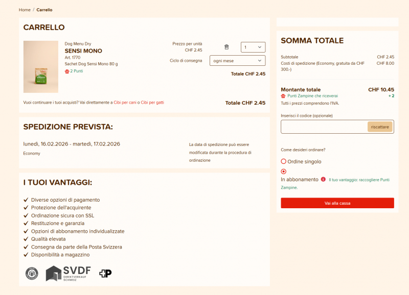 Per ogni acquisto ricevi un Punto Zampine per ogni CHF 1 di valore dell’ordine. Gli importi con decimali vengono arrotondati per eccesso a partire da 50 centesimi (ad esempio: un ordine di CHF 9.30 dà diritto a 9 punti, un ordine di CHF 9.80 dà diritto a 10 punti).